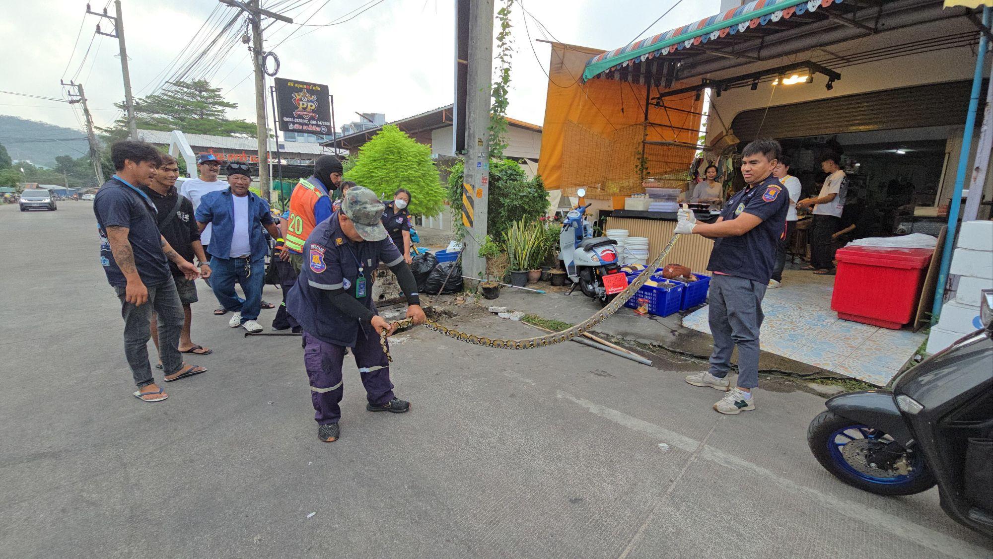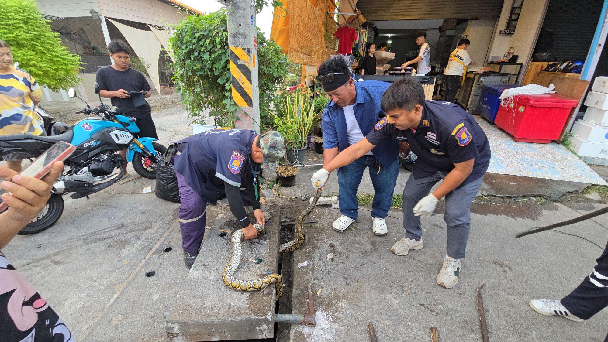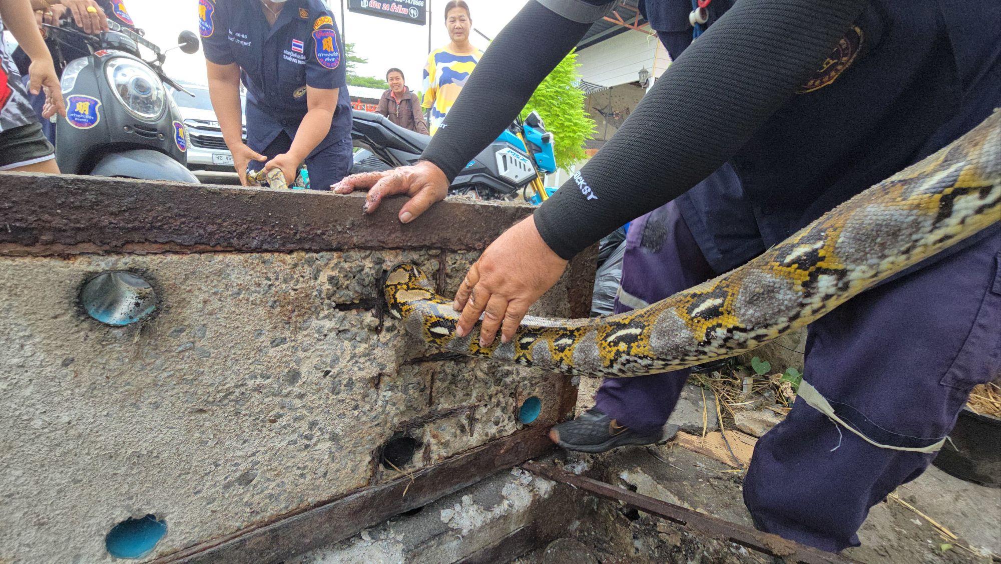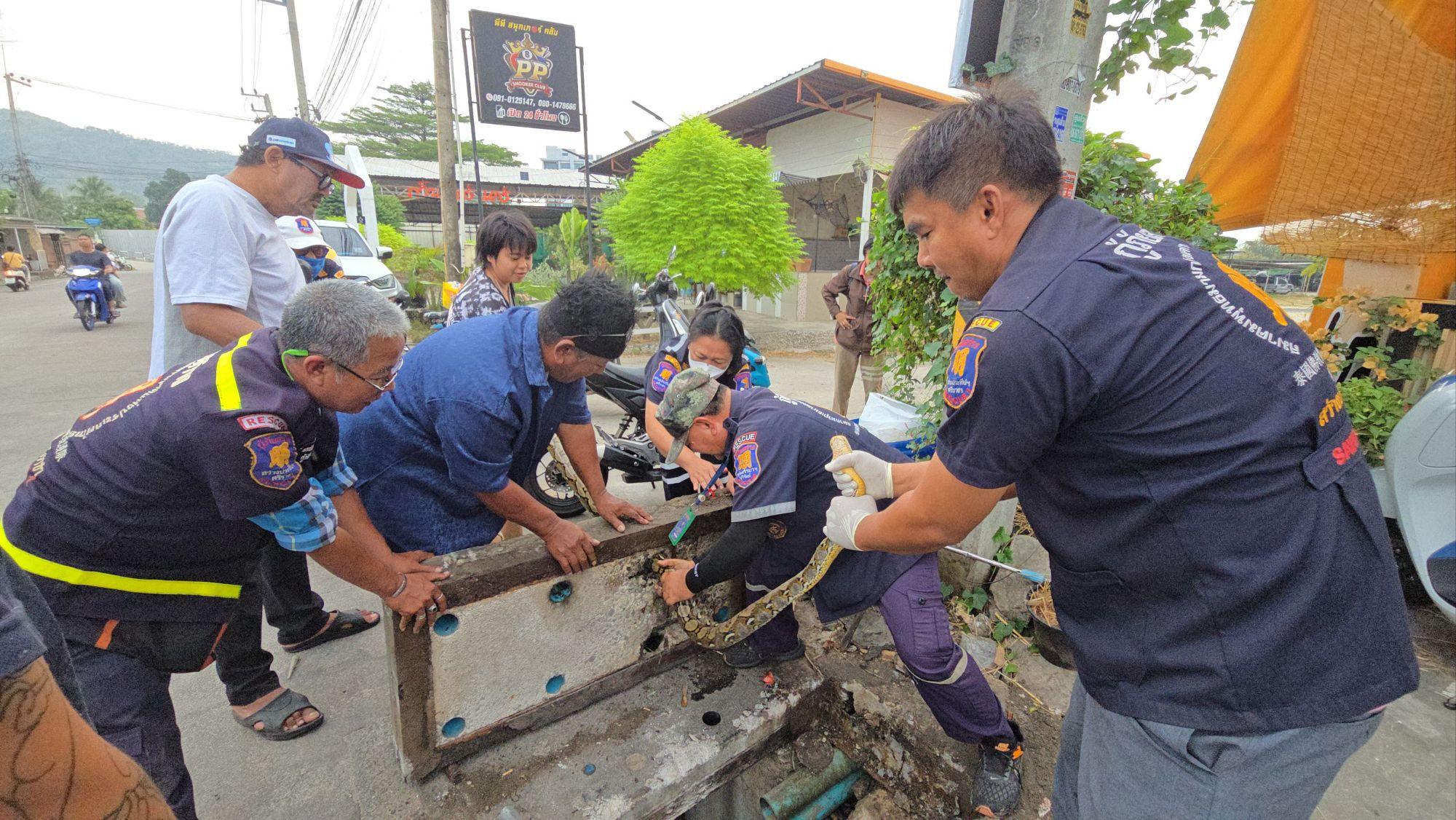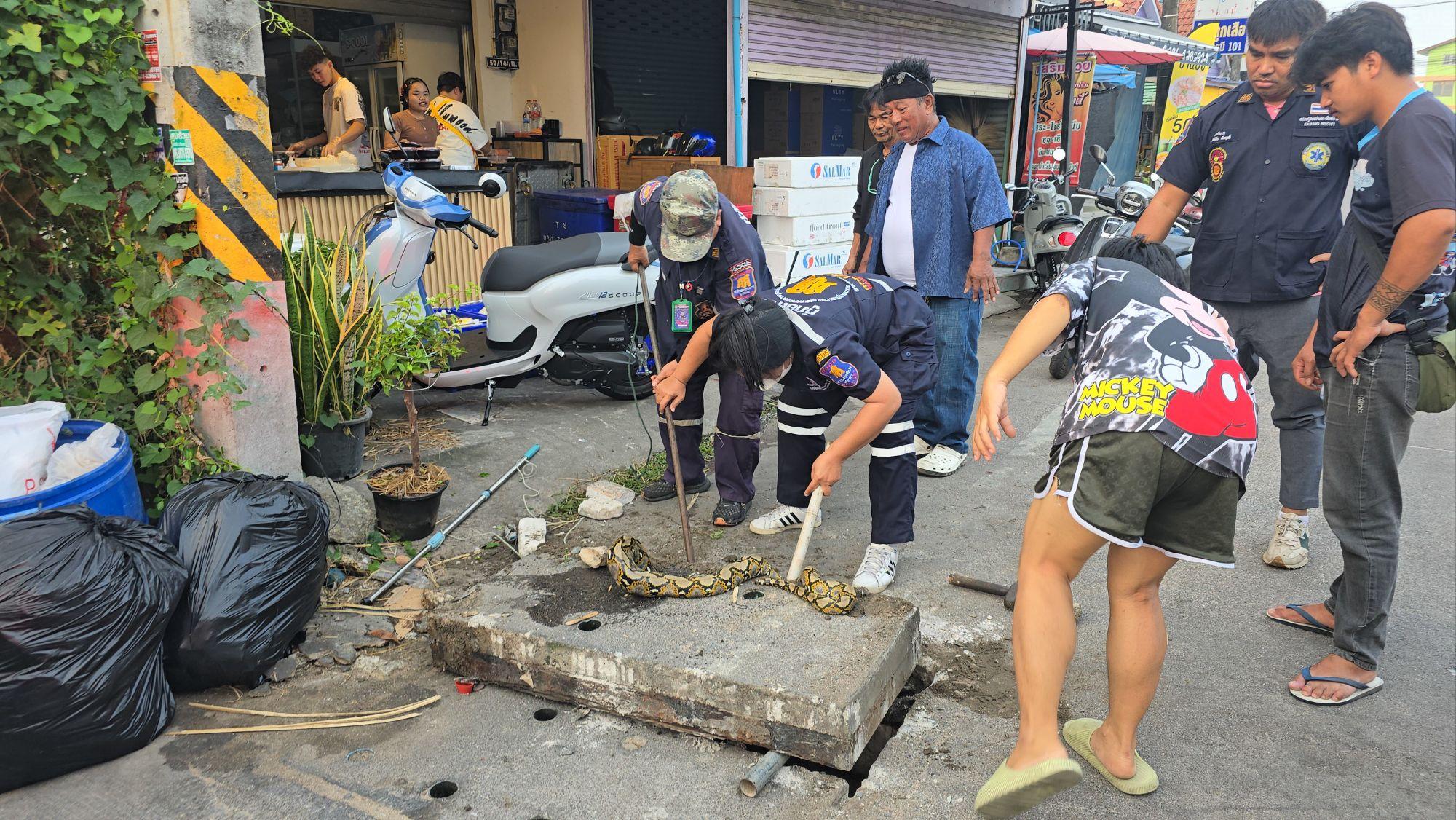 이 작전은 오전 7시경, 1번 마을 왓 카오탱온 입구 도로변에 위치한 "타이드 팟 수키 말라" 식당 주인인 로수콘 치차이옌(37세) 씨가 도움을 요청하면서 시작되었습니다. 그녀는 직원들이 아침 가게 문을 열었을 때 시멘트로 덮인 배수관 입구에 뱀이 끼어 있는 것을 발견했다고 신고했습니다. 이미 지나가던 사람들이 모여들어 이 특이한 광경을 구경하고 있었습니다.